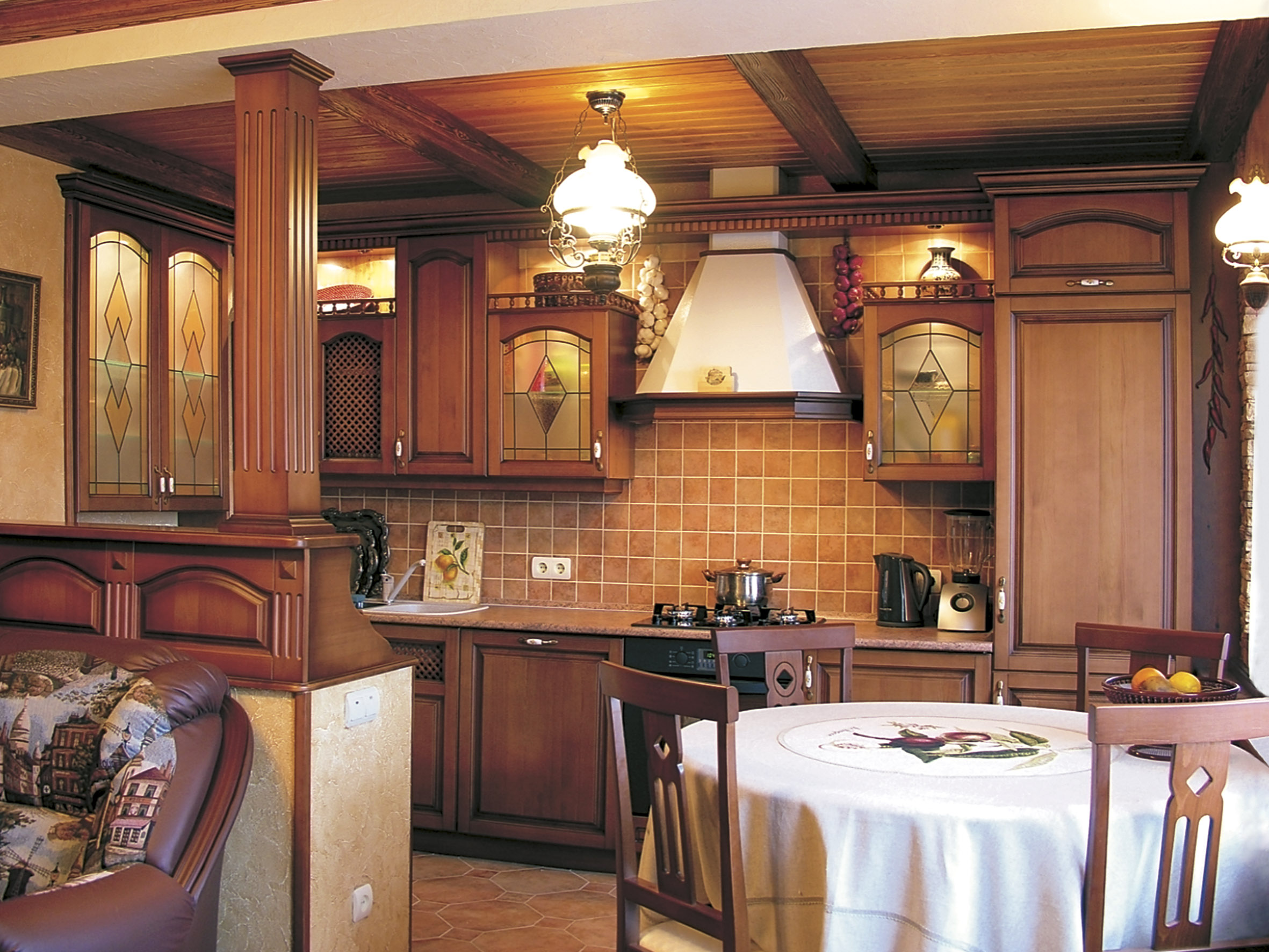 В этом помещении человек проводит много времени за готовкой и приёмом пищи. Важно, чтобы мебель здесь была практичной, удобной, долговечной и безопасной. Она должна успешно выдерживать температурные колебания и повышенную влажности. Для кухонных гарнитуров и иной мебели чаще используют сосну, ольху и дуб.